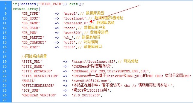 4.2、打開(kāi)/config.php,修改里面的數(shù)據(jù)庫(kù)配置、站點(diǎn)名稱等配置信息。